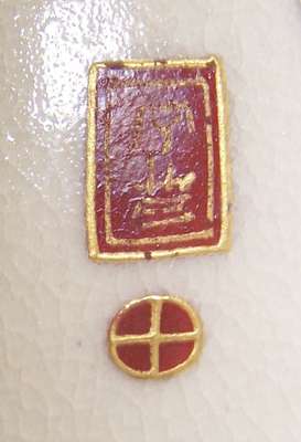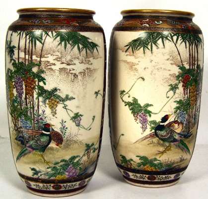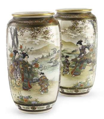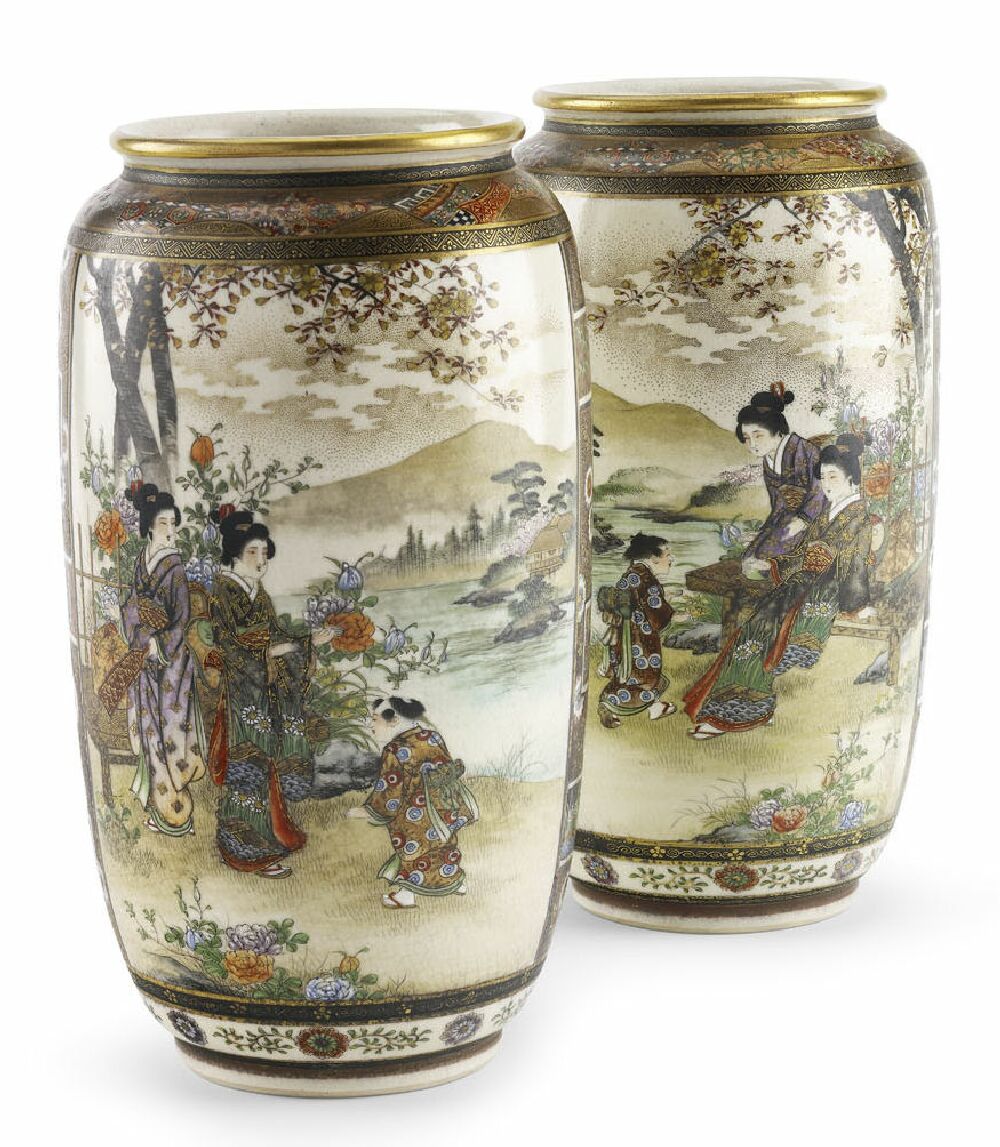 of ovoid form, each decorated with opposed panels, of two ladies and a child in a landscape on one side and exotic pheasants in a floral and bamboo setting to the other, with borders of stylised flowerheads and geometric forms (2)