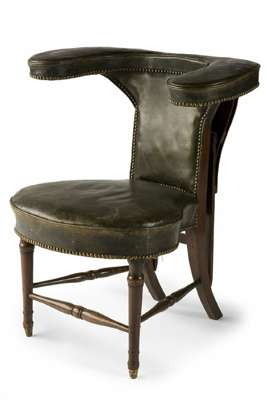 the leather covered U-form back with a ratchet adjustable reading table behind, the sloped seat on ring turned tapered legs joined by turned stretchers, (restorations, stretchers replaced)