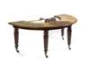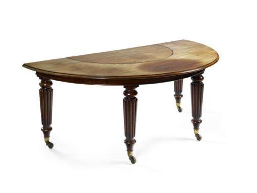 of demi-lune form with detachable inner leaf, the moulded frieze on four generously turned and reeded tapering legs with brass socket castors