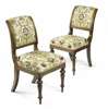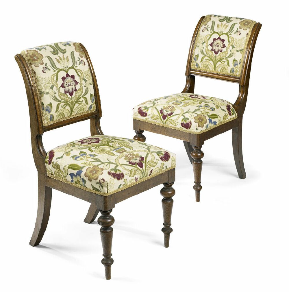 the rectangular padded scrollover backs above stuffover seats, on turned tapering legs, upholstered in Jacobean style tapestry, including one open armchair (11)