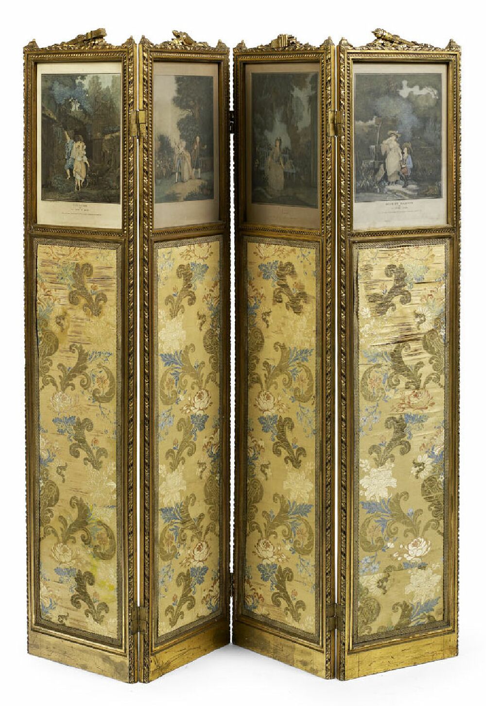 each upper glazed section with 18th century style fête galantes colour prints above 18th century needlework sections, the moulded frames with lappet and foliate rope-twist carving and each with an individual cresting, (faults to needlework)