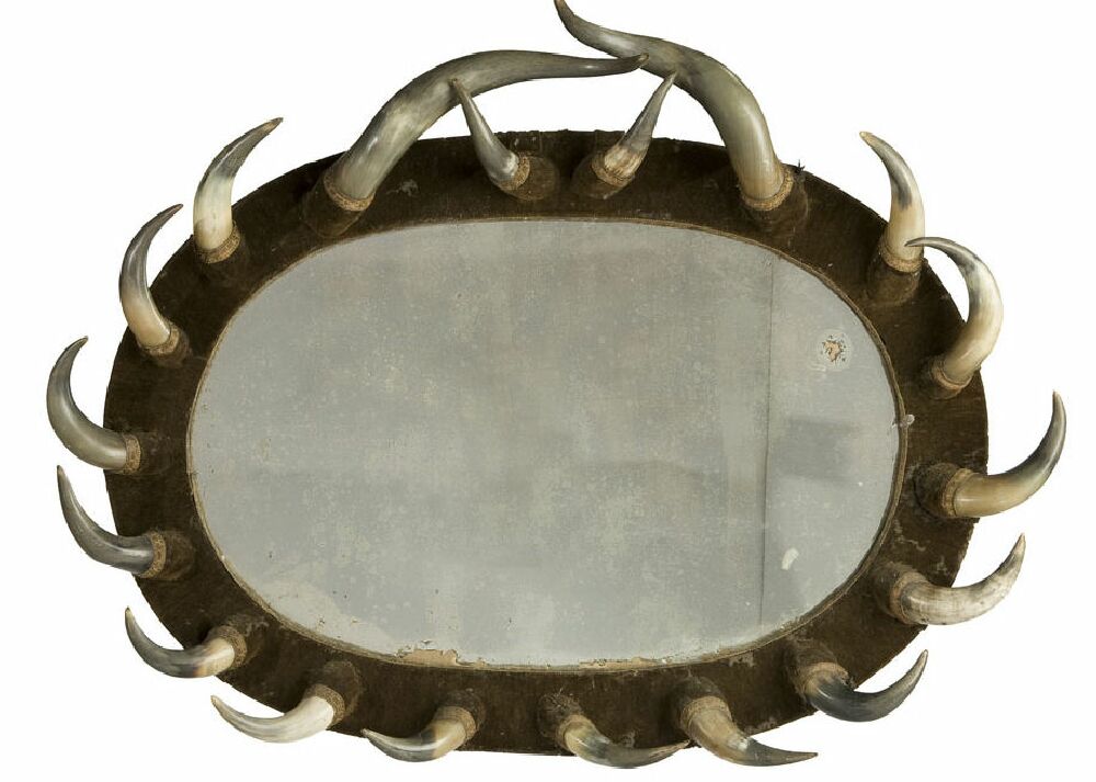 of elliptical form, mounted with two large horns at the cresting and sixteen further short horns in a symmetrical alignment, the frame covered in green velvet