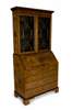 the dentil cornice above a pair of astragal doors and fall enclosing a fitted interior above four long drawers with embossed ring handles, on shaped bracket feet, the whole decorated with neo-classical ribbon-tied husks, urns and trophies, the slope centred by a vignette of two cherubs painting at an easel