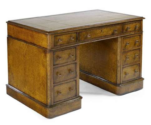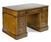 inlaid with stringing and rosewood banding, the moulded rounded rectangular top with a tooled tan leather inset above three drawers, the central frieze drawer controls locking of all the other drawers, each pedestal with three graduated drawers, rounded corners and plinth bases with concealed castors