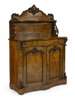 of serpentine form, the shelved ledge back with rococo carved surmount on pierced supports above a full width frieze drawer and two cupboard doors carved with floral frames between canted angles with leaf carved corbels, on plinth base and bun feet