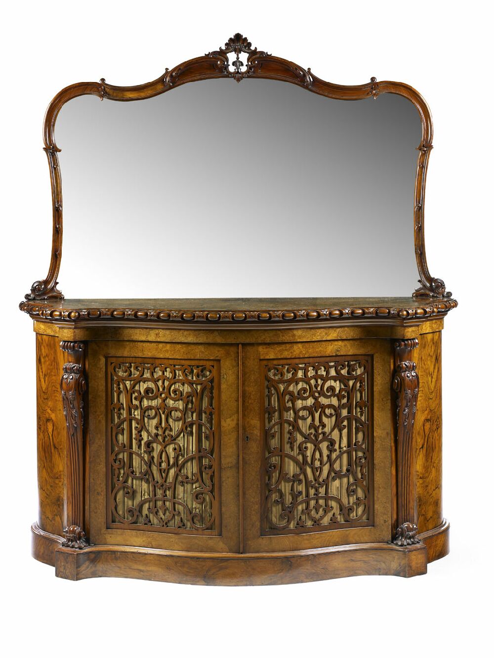of serpentine form, the arched mirror plate within a scroll moulded frame with central shell surmount, the base with an egg and dart carved edge above a pair of burr walnut and foliate scroll fretwork cupboard doors flanked by reeded shell and scroll pilasters, on plinth base
