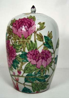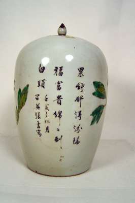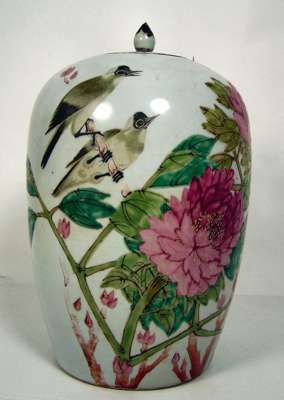 of ovoid form, decorated with bold chrysanthemums and birds on a branch, with Chinese characters to the reverse side