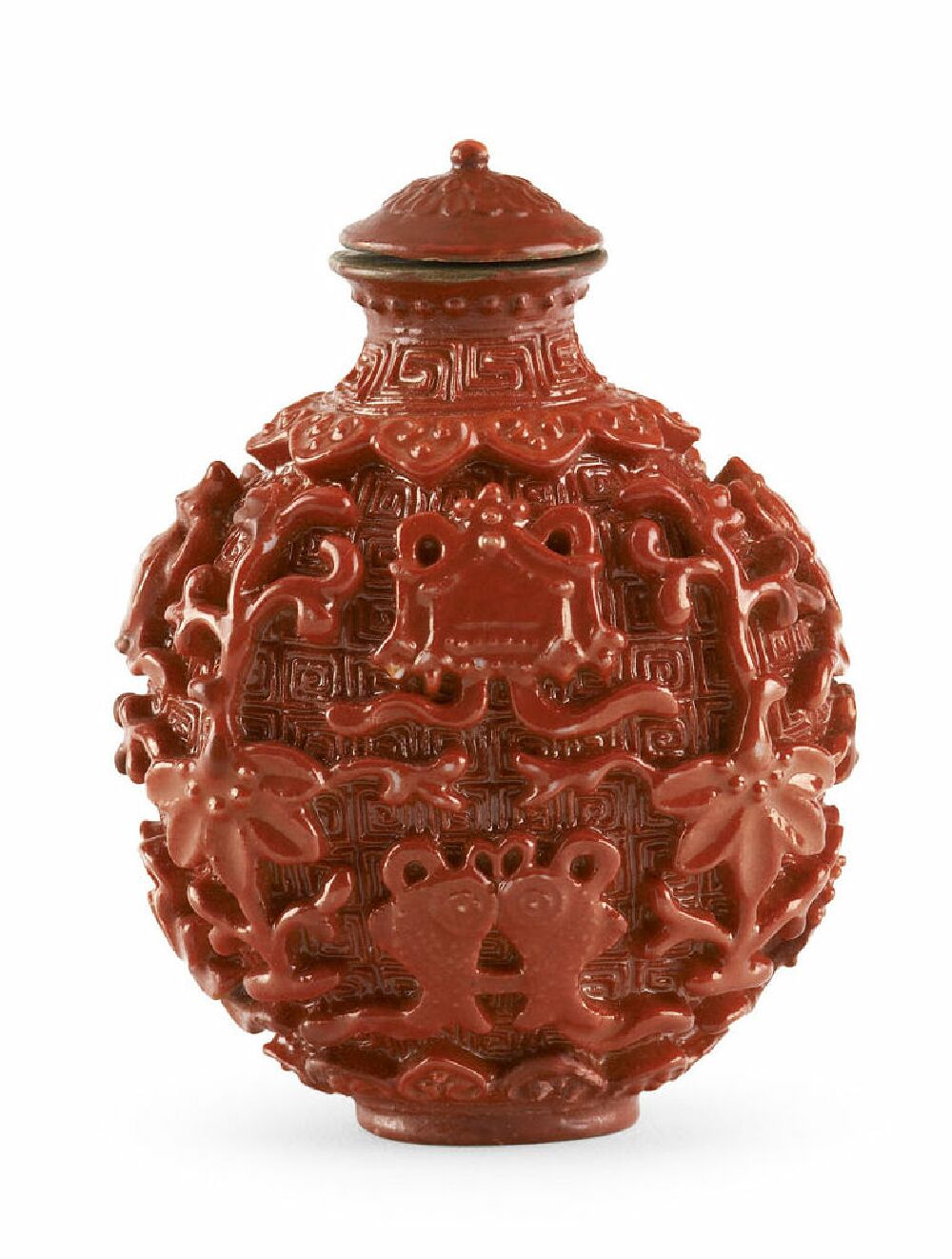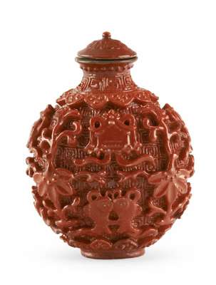 A Chinese moulded porcelain snuff bottle with coral glaze, 1780-1830