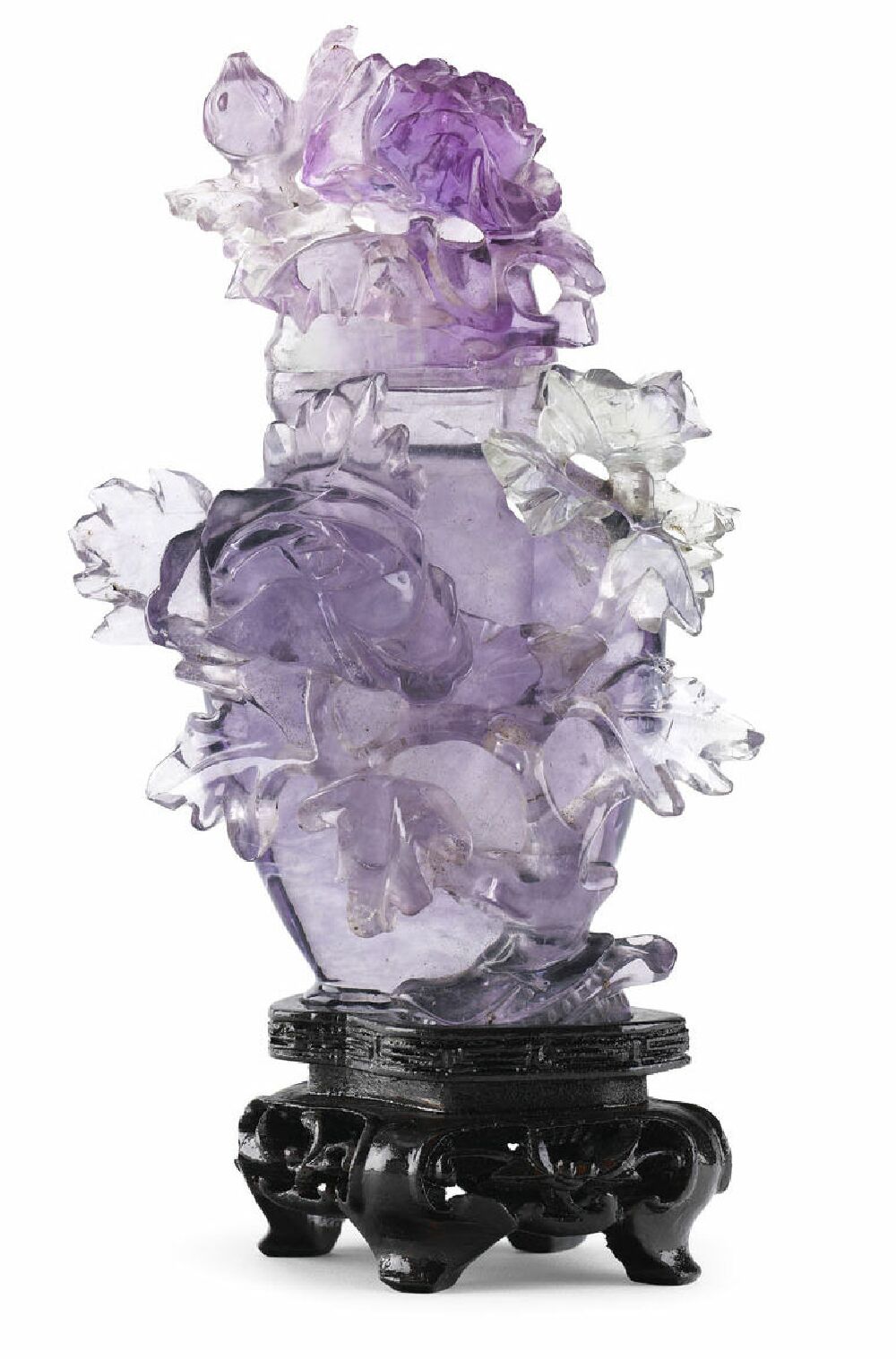 profusely relief carved with flowers, on a fitted stained wood stand