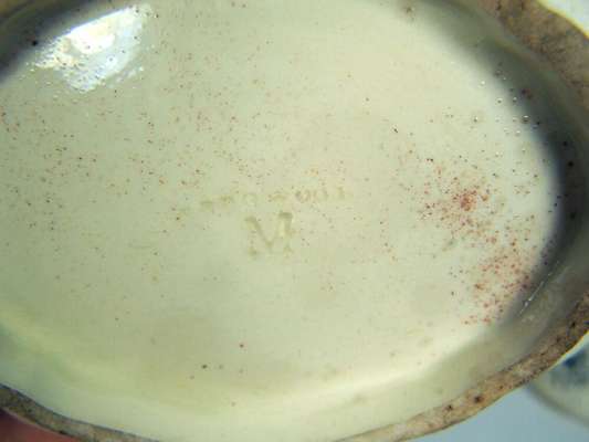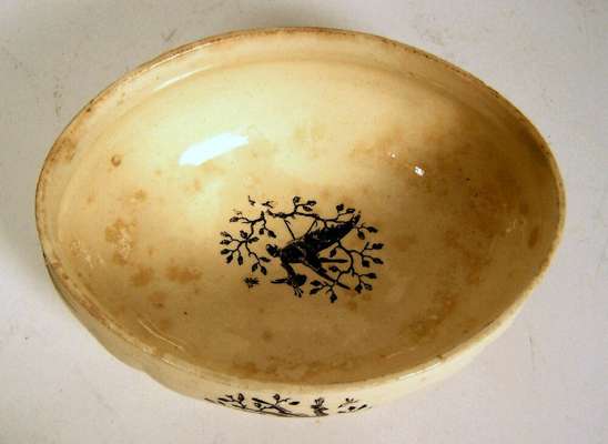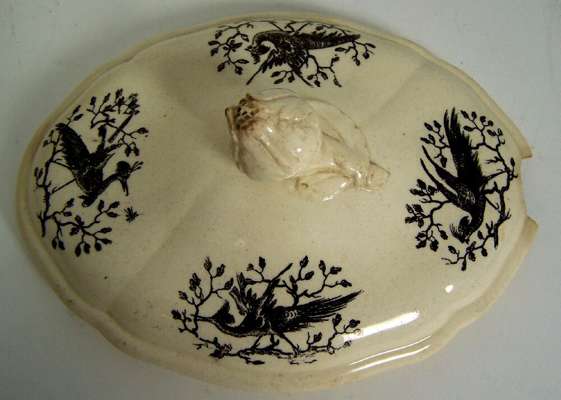 of oval form, with rosebud finial, printed in black with vignettes of peacocks and exotic birds amongst branches, impressed mark