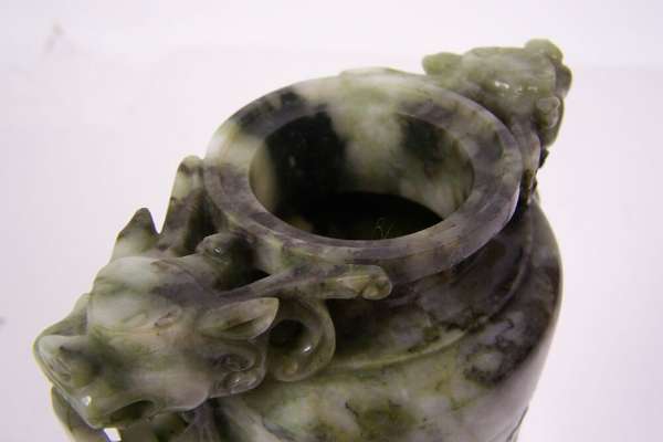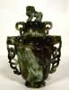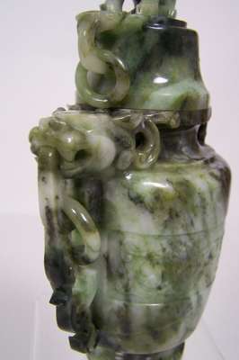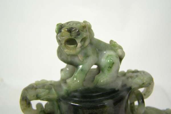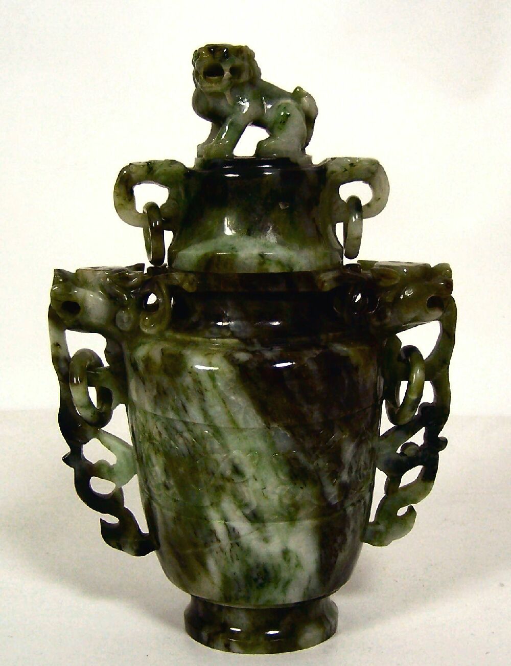 the cover surmounted by a lion dog finial and with twin elephant's head and ring handles, the body of shouldered ovoid form with twin lion's head, ring and scroll handles, with a carved band of mythical animals