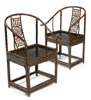 the arched wrap around backs with downswept outscrolling arms and fretted splats above solid seats on bamboo framed legs united by perimeter stretchers (2)