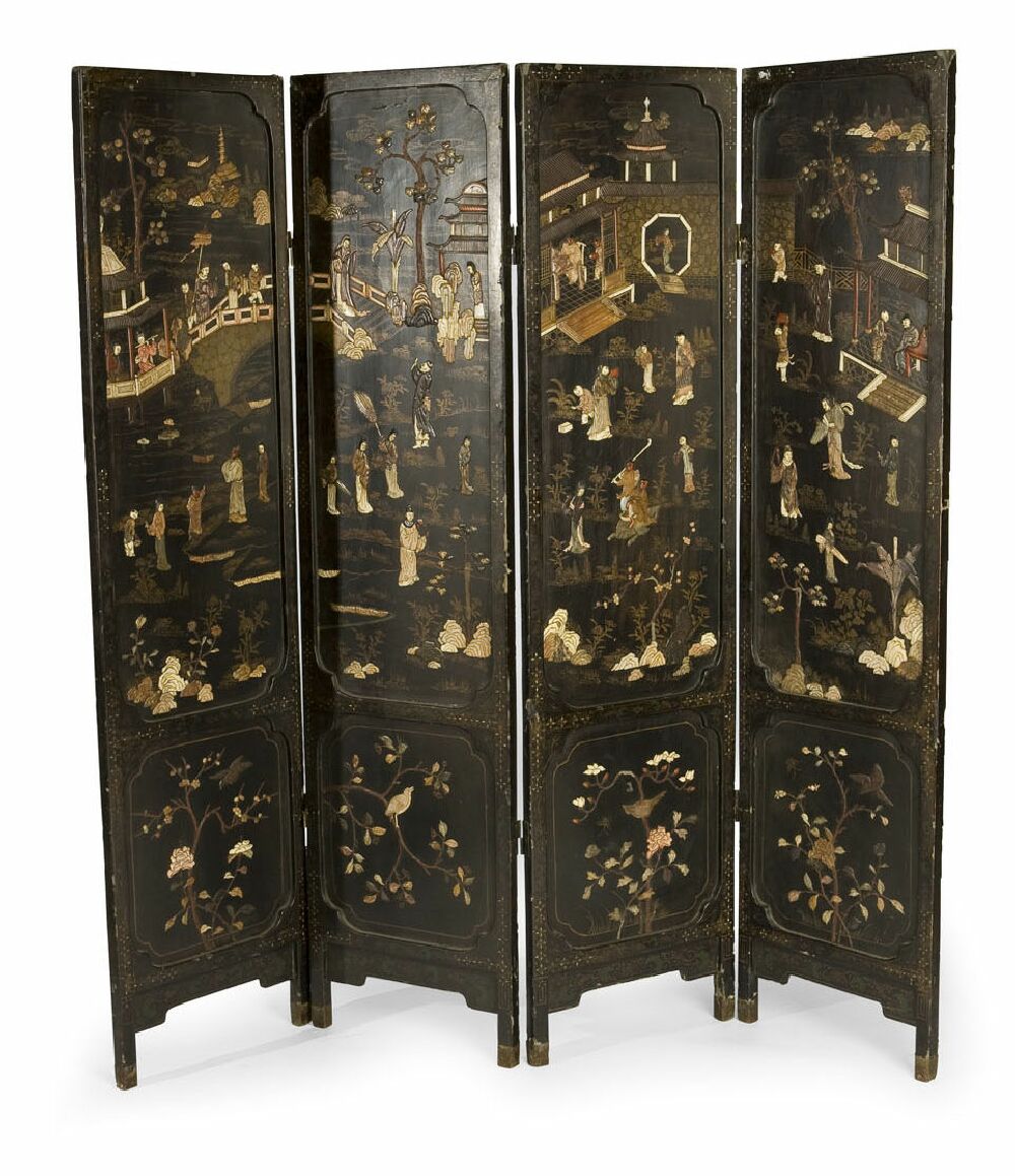 A 19th century Chinese lacquer, hardstone and ivory applied four fold dressing screen