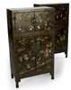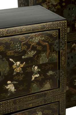 A pair of Chinese brown lacquer decorated and hardstone inlaid cabinets, first half 20th century