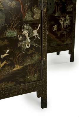 the doors decorated with figures in landscapes and hunting scenes, the sides with flowering branches with birds and butterflies, the lower doors enclosing central shelves with two drawers, raised on stile feet with brass caps (2)