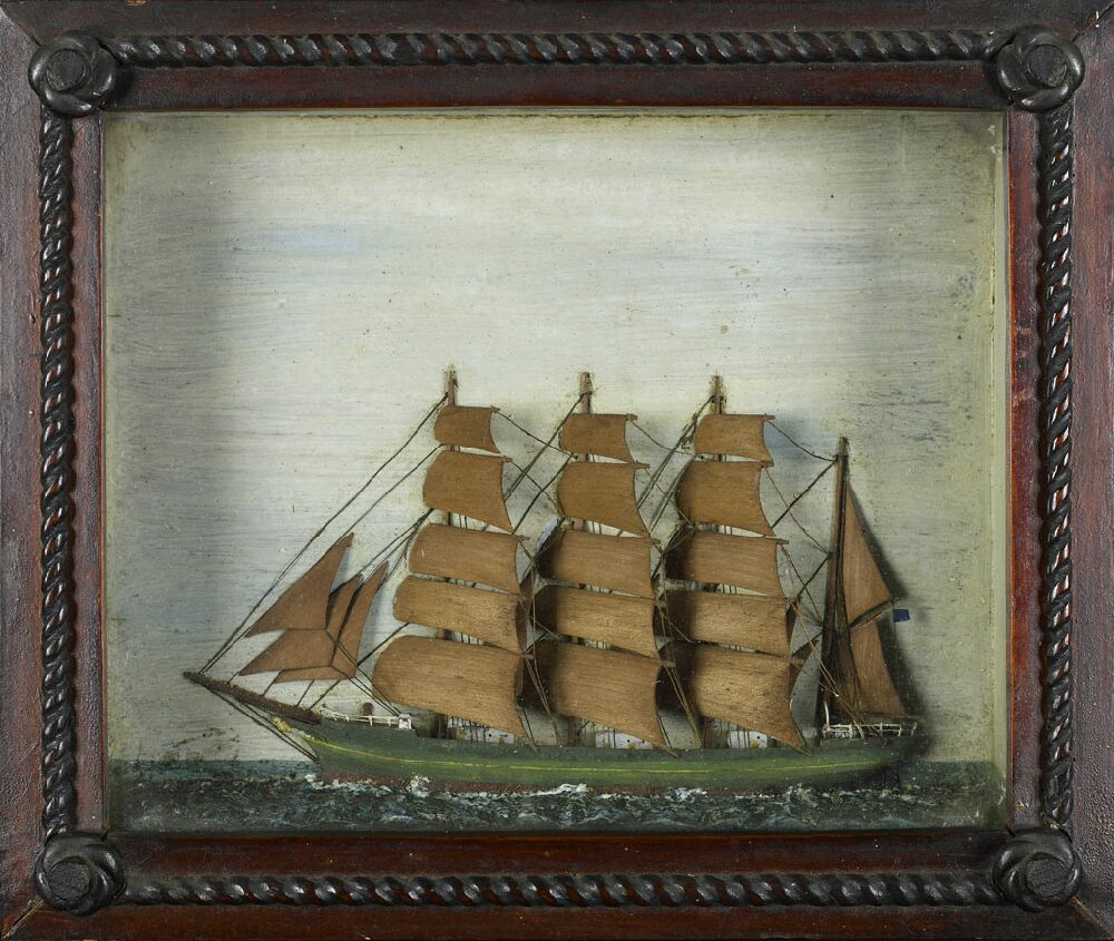 the wooden half model with green painted hull, side railing and rigging, within a naturalistic painted interior with spume rising against the hull, the stained pine frame bordered with rope twists and 'knots' to each corner