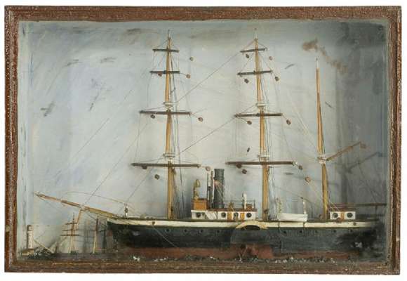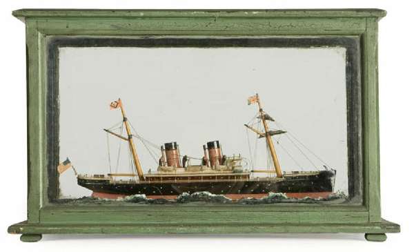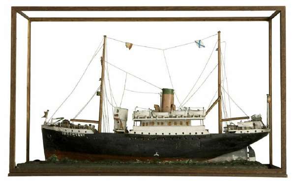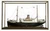 comprising: the 'Rose', a twin funnel steamer flying the American and British flags and ensign 'T', model 35cm long, 15cm high; a single funnel paddle steamer, with a smaller ship and ketch below beside a miniature coastal village, 47cm wide, 33cm high; the 'Sophia', a single funnel steamer, 44cm wide, 20cm high; the 'Drechtoyk', a large single funnel steamer with eight lifeboats, 65cm wide, 37cm high, within glazed display cases and naturalistic settings (4)