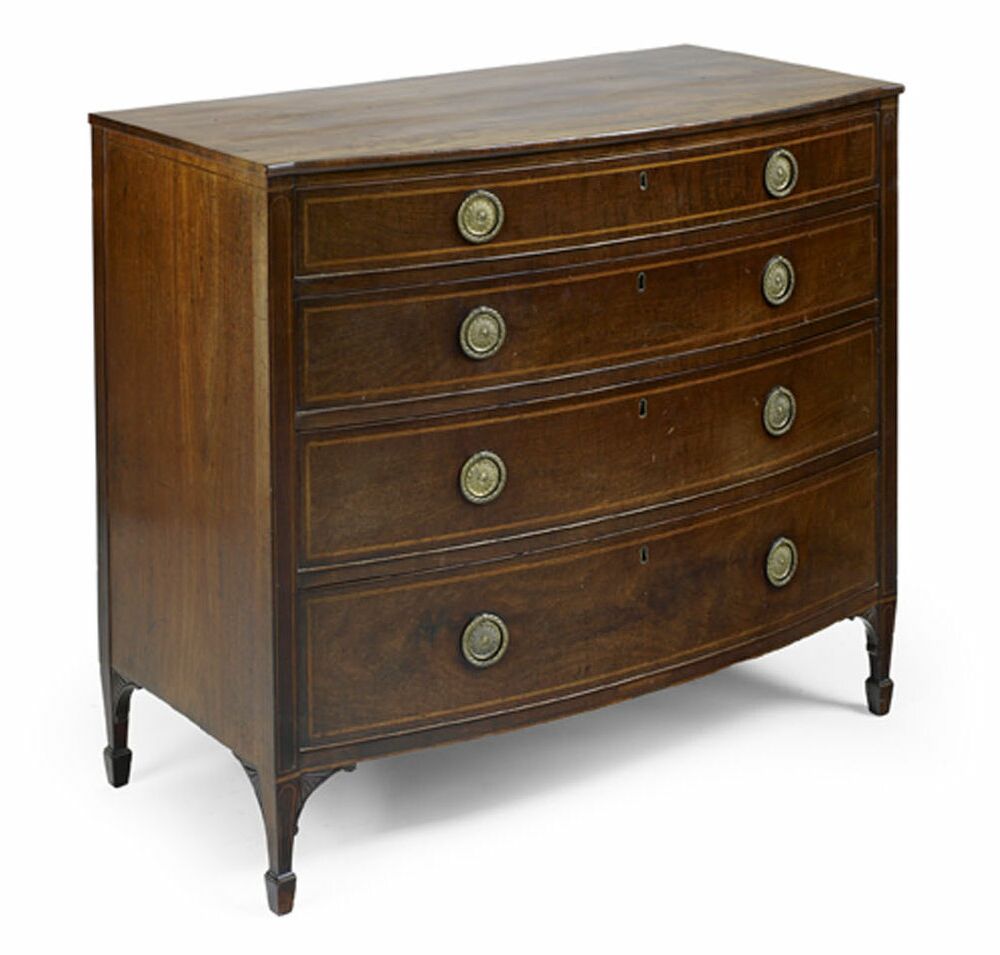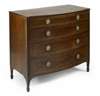 with four long graduated drawers, each with a narrow cross banding and gilt metal ring handles, on short square tapering legs with fan brackets and spade feet, the whole inlaid with boxwood lines