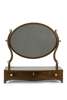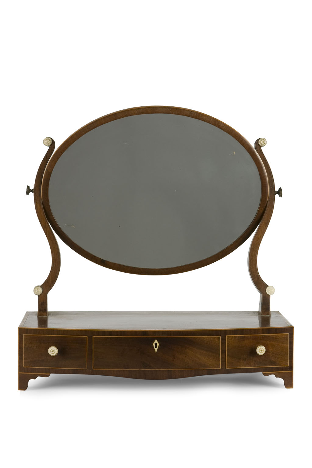oval glass, scrolled supports with applied ivory discs, bow front platform base with kingwood banding and stringing, fitted with three drawers, bracket feet