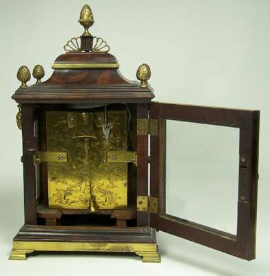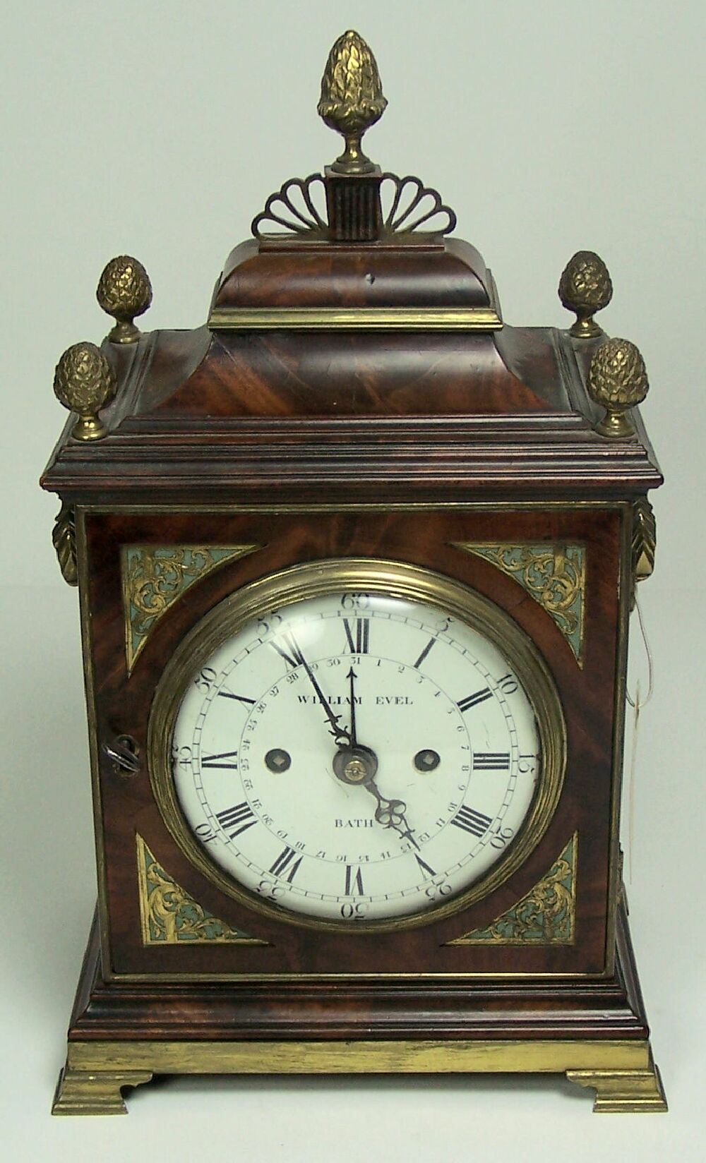 the 5in white enamel dial with twin winding arbors and marked 'William Evel, Bath', the twin train eight day fusee movement striking on a bell, the backplate etched with foliate arabesques, the cavetto moulded flame mahogany top with pine-cone finials, the glazed sides with brass loop handles, the mahogany door with chased foliate pierced corner spandrels, the whole raised on ogee bracket brass feet