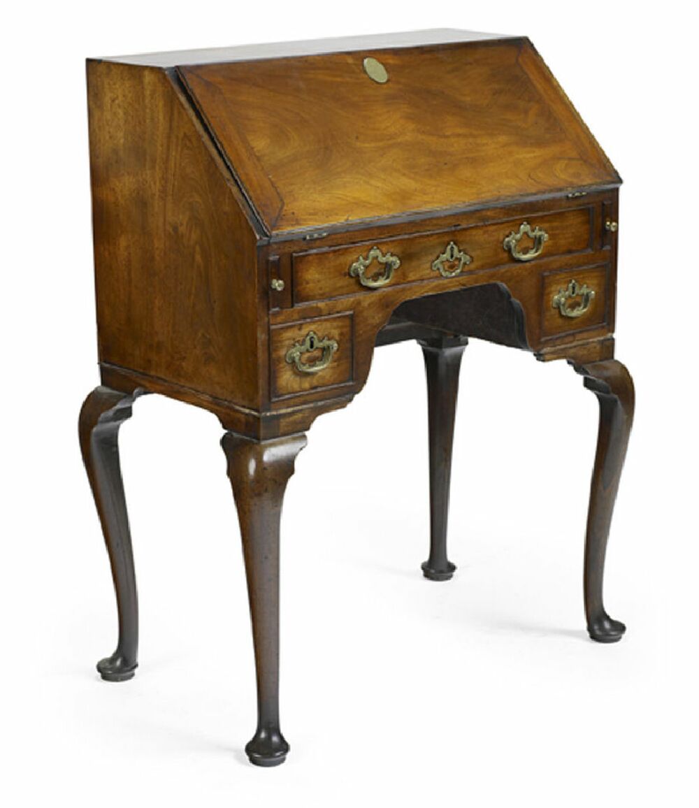 of small proportions, the fall enclosing a fitted interior of stationery racks and short drawers above a serpentine carved kneehole bounded by a shallow full width frieze drawer and two short drawers with pierced backplate bail handles, on cabriole legs ending in pad feet