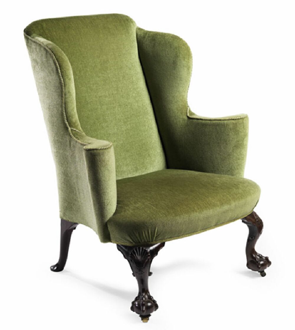 upholstered in green dralon, cabriole front legs with scallop knees, ball and claw feet