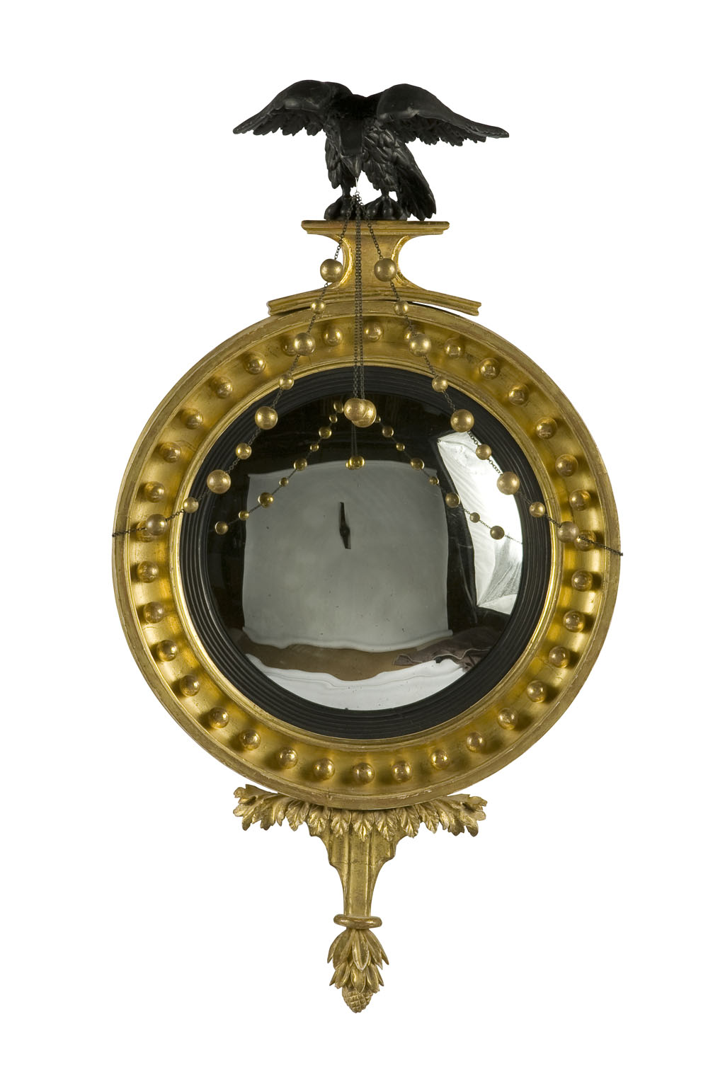 with convex plate, ebonised slip cavetto moulded with applied beads, surmounted by an eagle with a tied pendant (regilded)