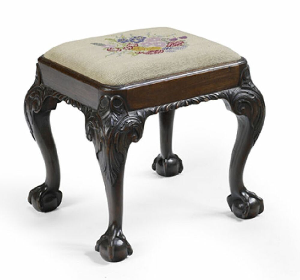 the rectangular caddy moulded top with later gros point needlework, above gadrooned aprons and bold acanthus carved cabriole legs ending in claw and ball feet