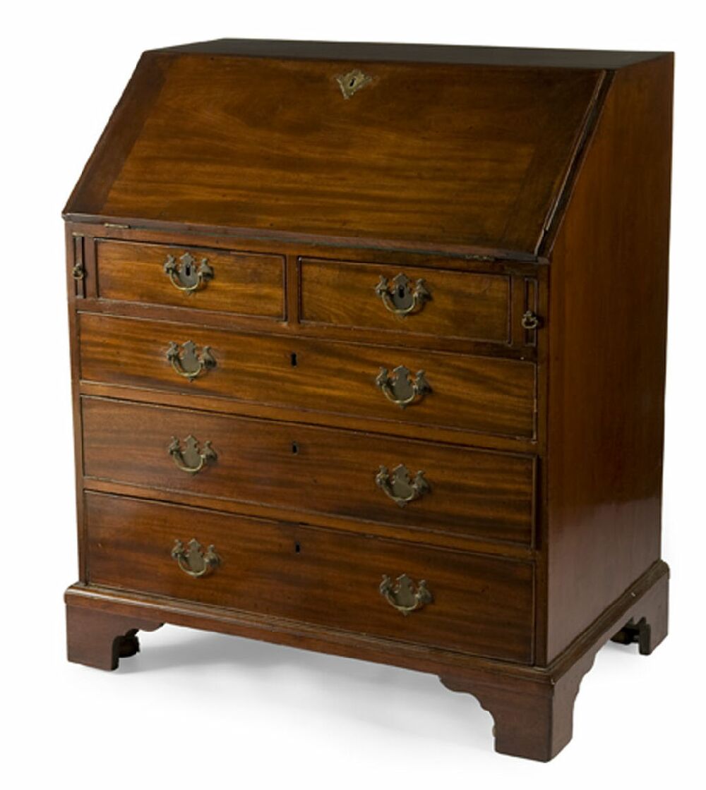 the fall front revealing a fitted interior of pigeonholes, eight graduated drawers, a long drawer and a baize inset, above two short and three long graduated drawers, on shaped bracket feet with concealed castors