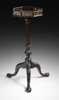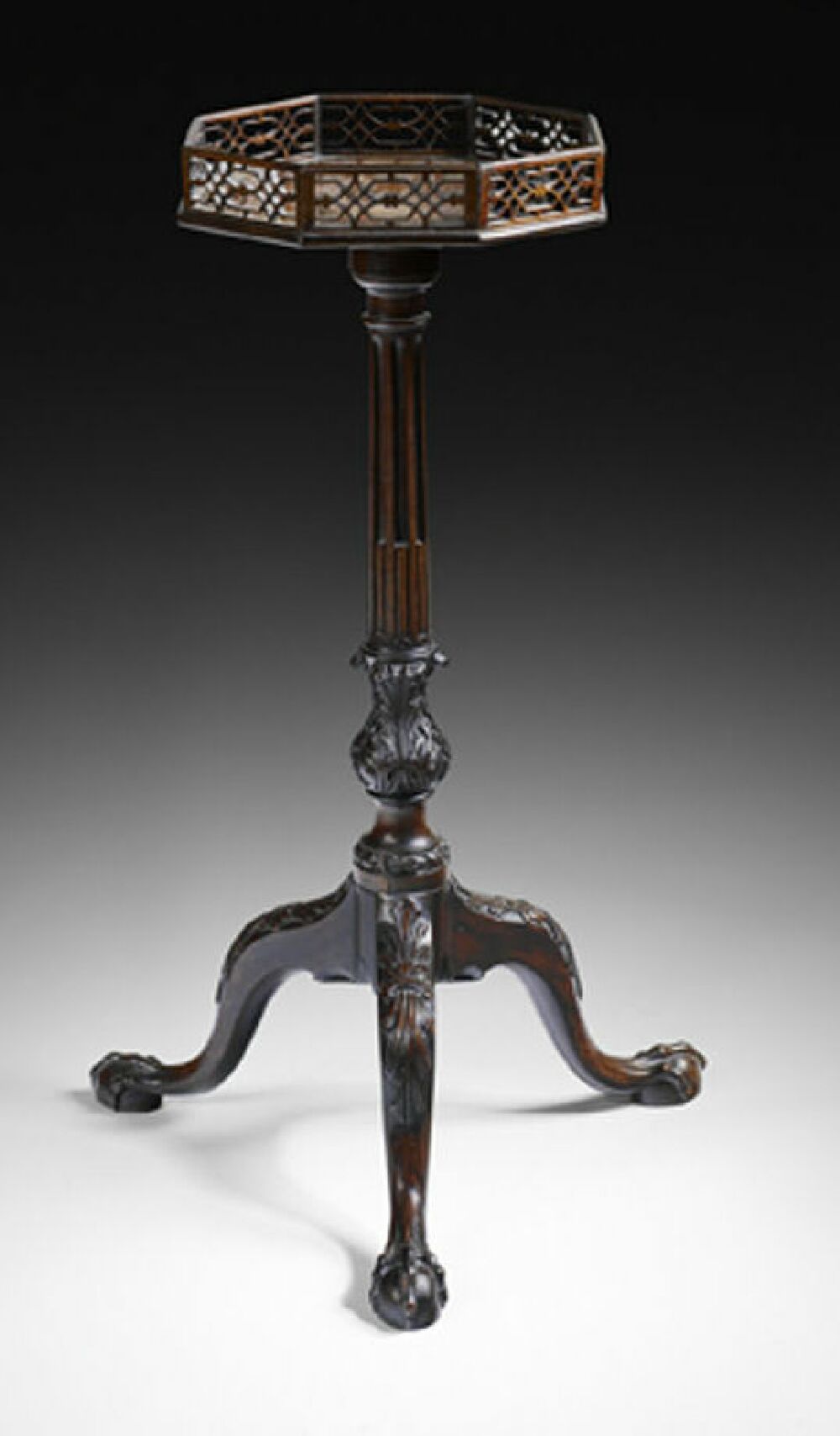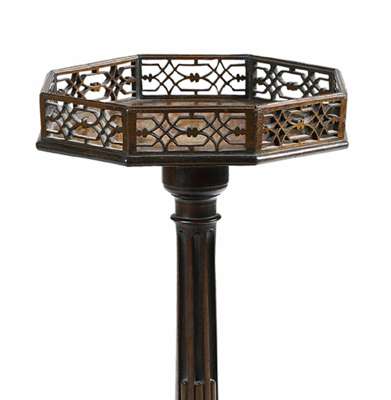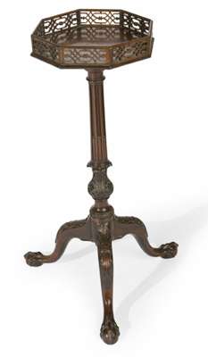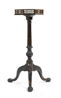 the octagonal pierced fretwork gallery with caddy moulded top rail above a stop-fluted baluster column with a fine leaf carved knop, on a rocaille carved cabriole tripod base with tied acanthus sprays, ending in talon and ball feet