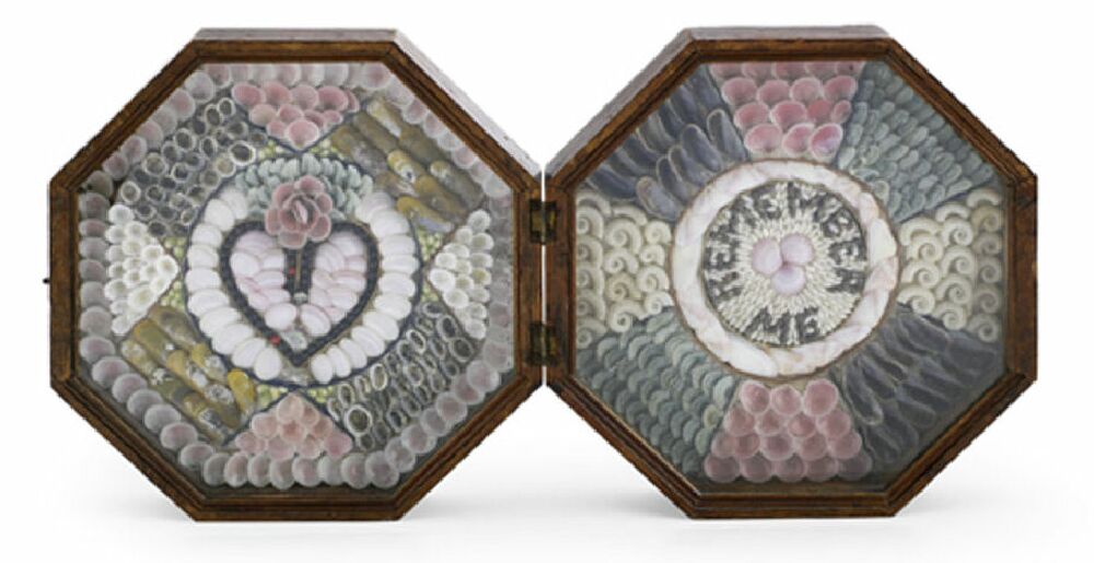 in a folding octagonal mahogany case, comprising various coloured shells in segmented radial arrangements, bears motto, 'REMEMBER ME'