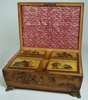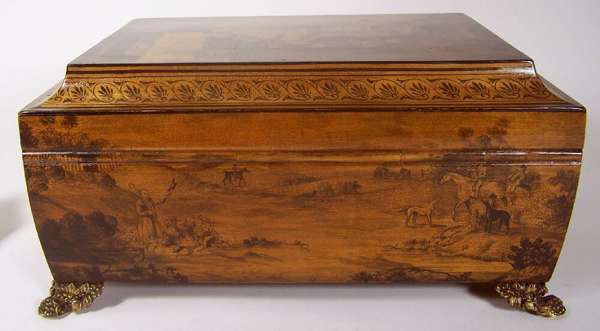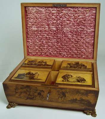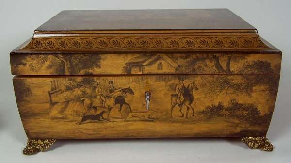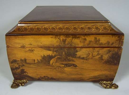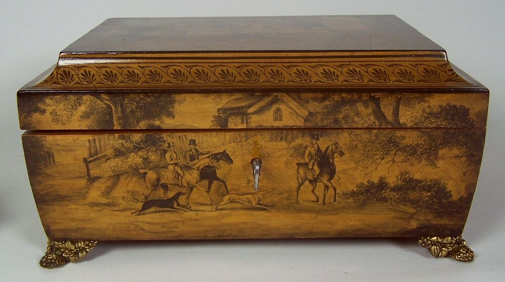 the cavetto moulded hinged lid with a domestic scene probably involving payment of rent, the front back and sides depicting fox hunting scenes, the interior with a removable divided tray and four boxes, each lid with scenes of everyday life, raised on embossed brass feet, bears paper label, 'Smith and Co. Carvers and Gilder's, 78 Union Street, Aberdeen'