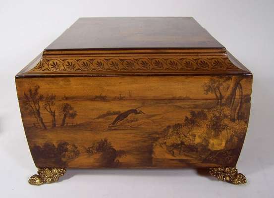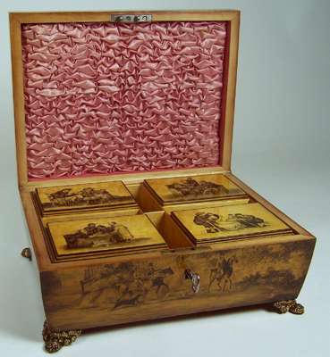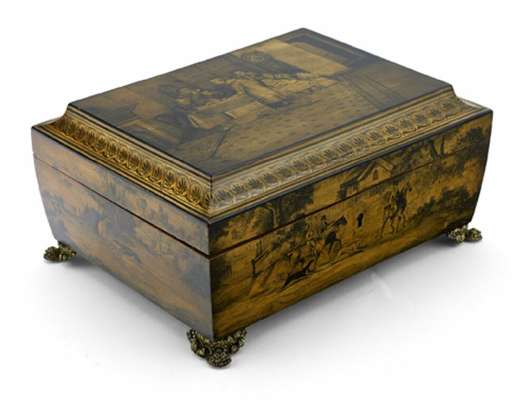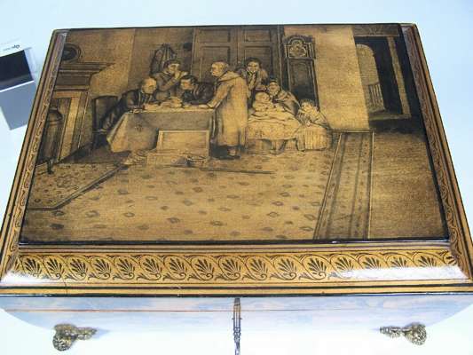 Note: the penwork scene decorating the lid of this fine box is adapted from Sir David Wilkie's 1807 painting 'The Rent Day.' One of the boxes in the interior also features this picture.