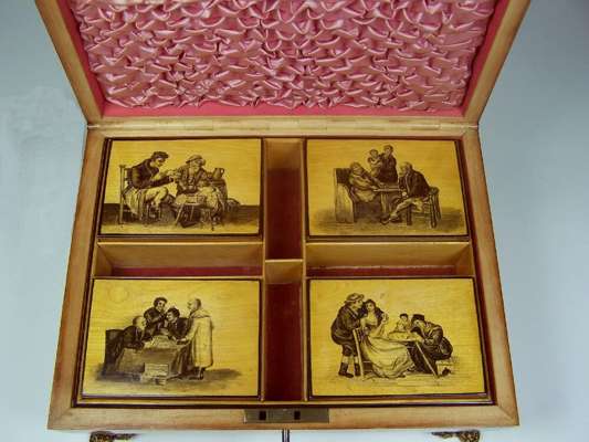 A Victorian Scottish penwork games box Decorated with scenes after Sir David Wilkie