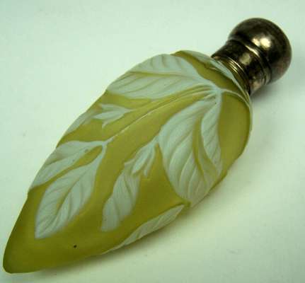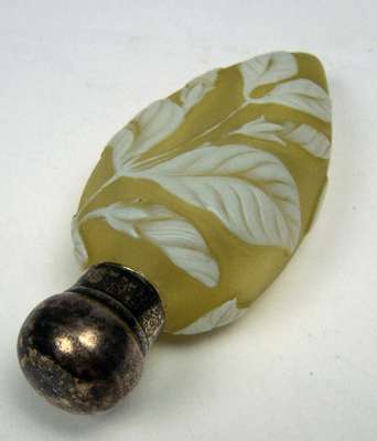 The oviform yellow body overlaid in white and cut with a design of a flower and leaves, the neck with screw fitting and globular stopper, silver mounts marked for Sampson Mordan, London, 1884