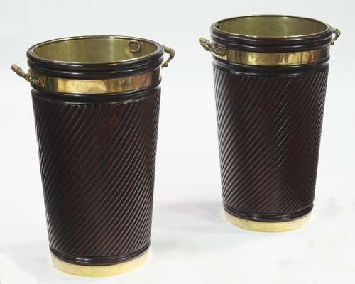 with fixed leaf cast brass carrying handles, of spirally reeded form, with detachable brass liners (2)