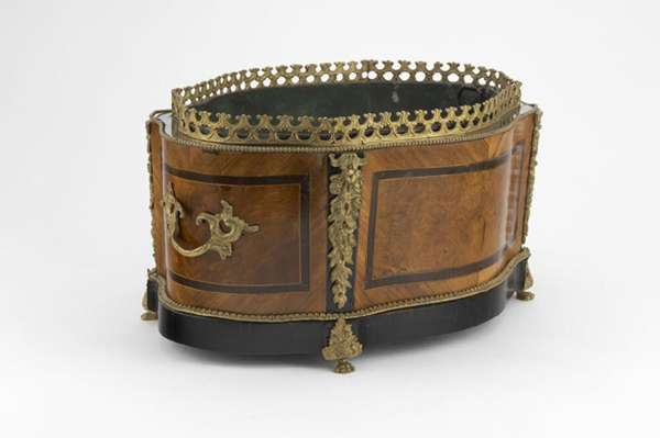 of serpentine outline with pierced giltmetal gallery and metal liner, the sides crossbanded in purpleheart, on skirted base with lion paw feet, the whole with rococo cast handles and mounts, a label verso inscribed 'Ls. Grade'
