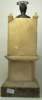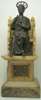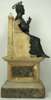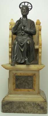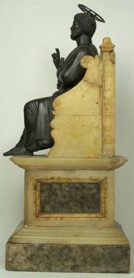 of a seated deity, the robed bronze figure pointing and holding a key, on a stepped mottled marble panelled pedestal