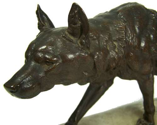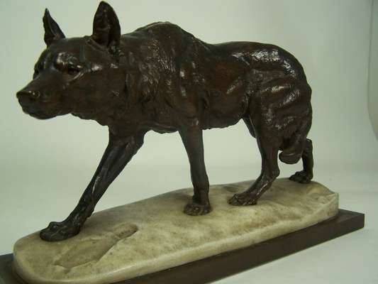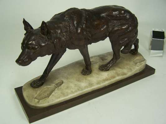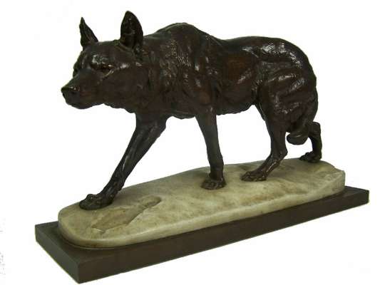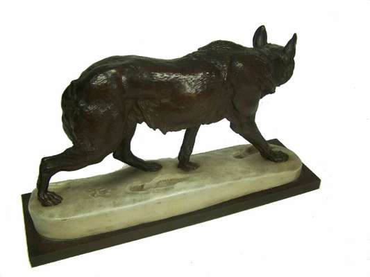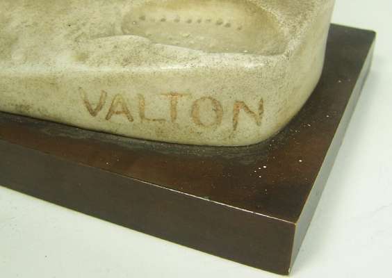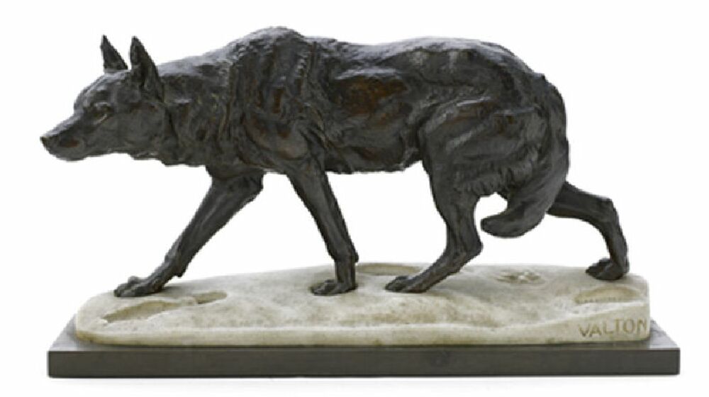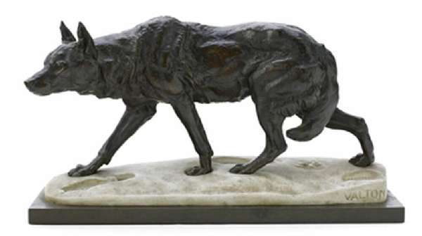 Bronze, the white marble naturalistic base with human footprints in the snow, signed, 'VALTON' on a bronze base