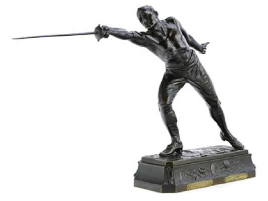 Bronze, signed R Kuchler, inscribed international fencing fate, Italian exhibition, London, presented by charles Hancock Esq, Won by Maurice le Maitre, rich mid and dark brown patination, set on its own base