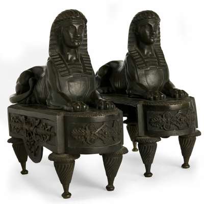 each facing forward on paw feet above shaped friezes decorated with anthemia and ribbon-tied pole trophies, on spirally fluted and leaf-cast toupie feet, dark green patination (2)