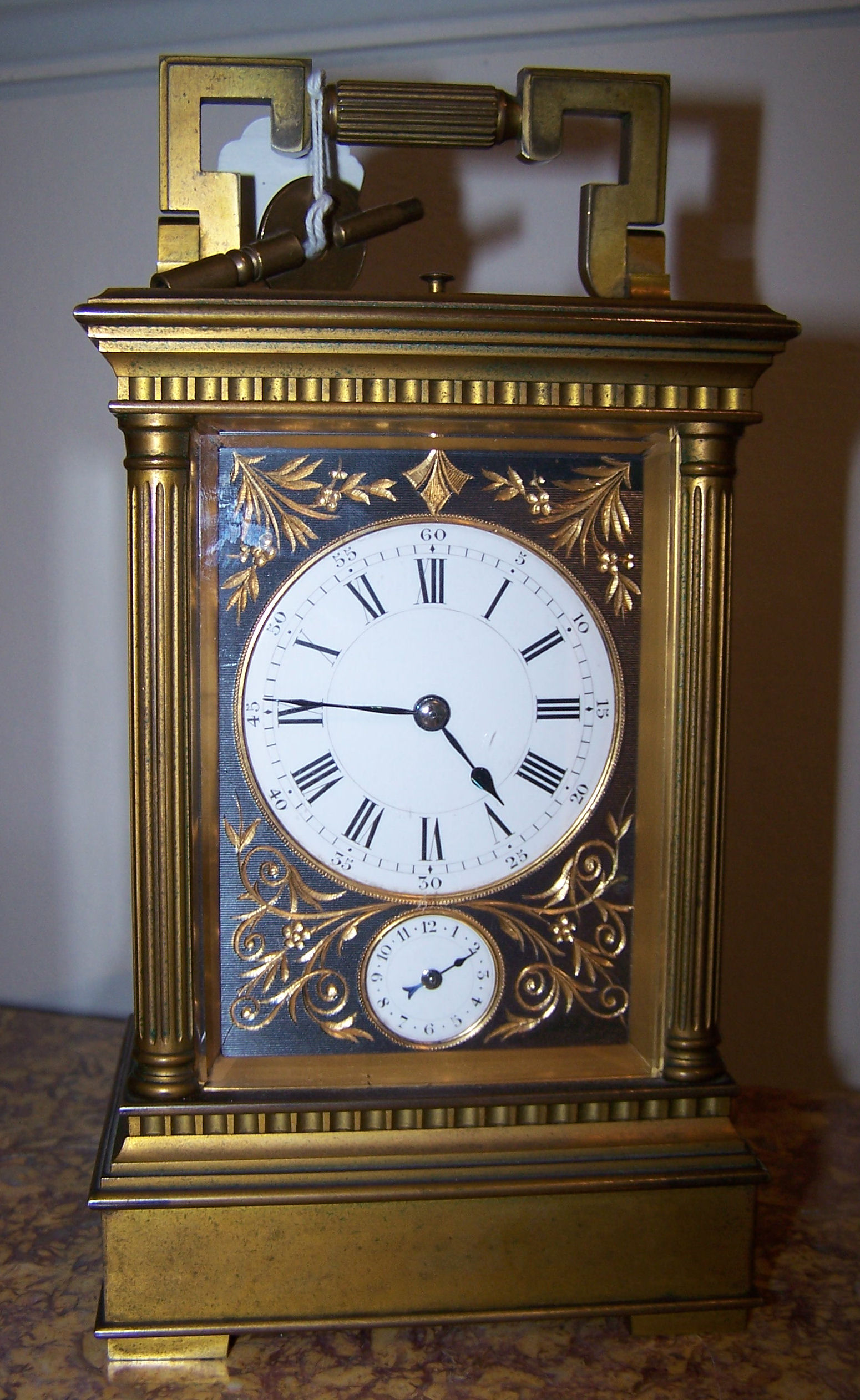 the engine turned foliate engraved mask with a white enamel dial with roman chapters and a subsidiary alarm dial with arabic chapters, the eight day alarm movement with lever escapement, striking on a gong, within a pillared gorge case