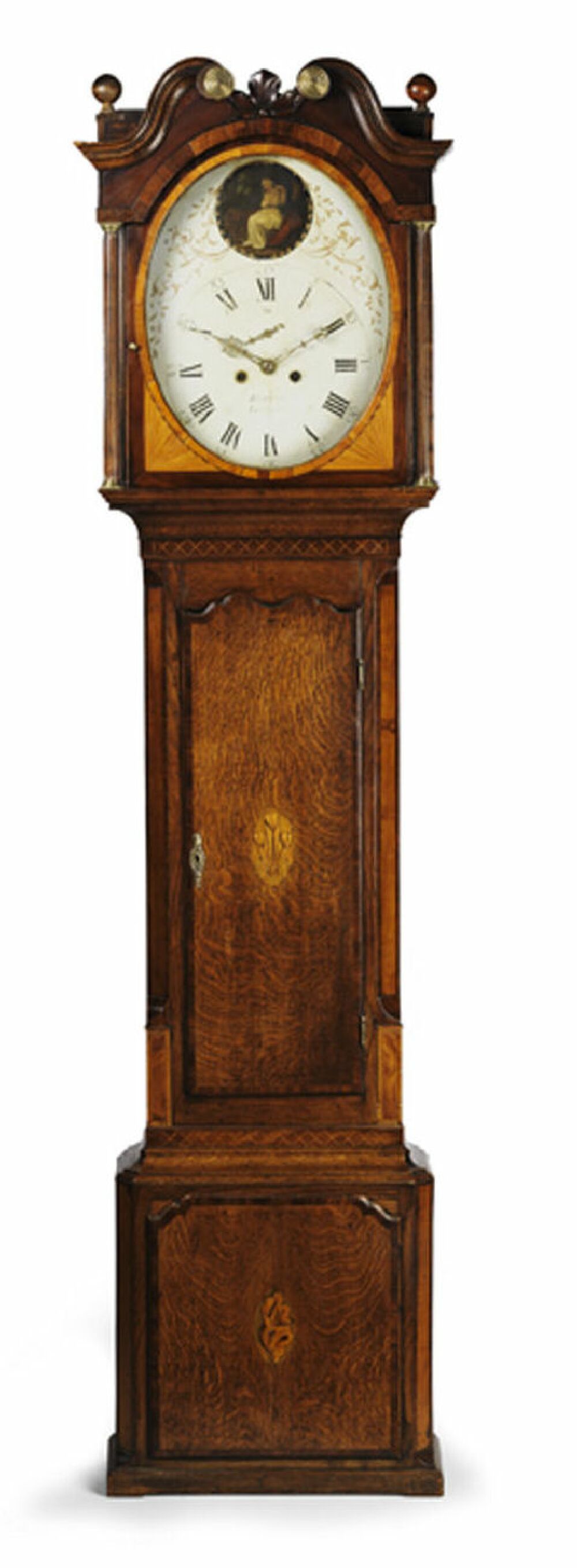 the oval white painted face with a 12 inch dial and marked "Bickerton, Ellesmere", with a subsidiary second dial and oval painted maiden to the arch, with eight day twin train movement striking on a bell, the broken arch hood with satinwood banding and fan corners enclosed by fluted columns, the case with satinwood canted corners, chevron banding and a shell and fleur de lys inlaid oval medallions