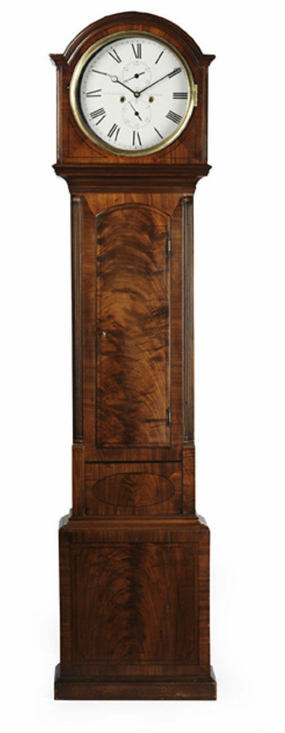 the white enamel 12 inch dial marked 'J. Breckenridge, Edinburgh' with subsidiary second and calendar dials and twin winding apertures, the eight day twin train movement striking on a bell, the arched case inlaid with ebonised stringing and the flame veneered trunk door flanked by fluted quarter columns