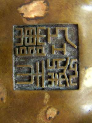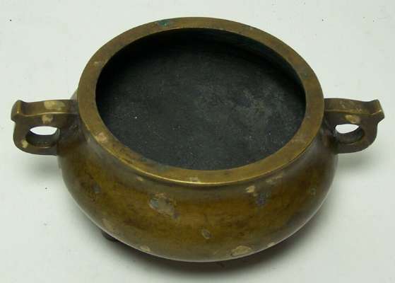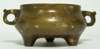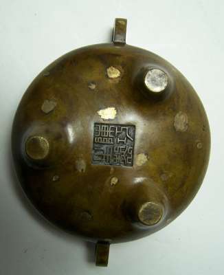 of squat globular form, with two loop handles, raised on three squat feet, impressed mark to base