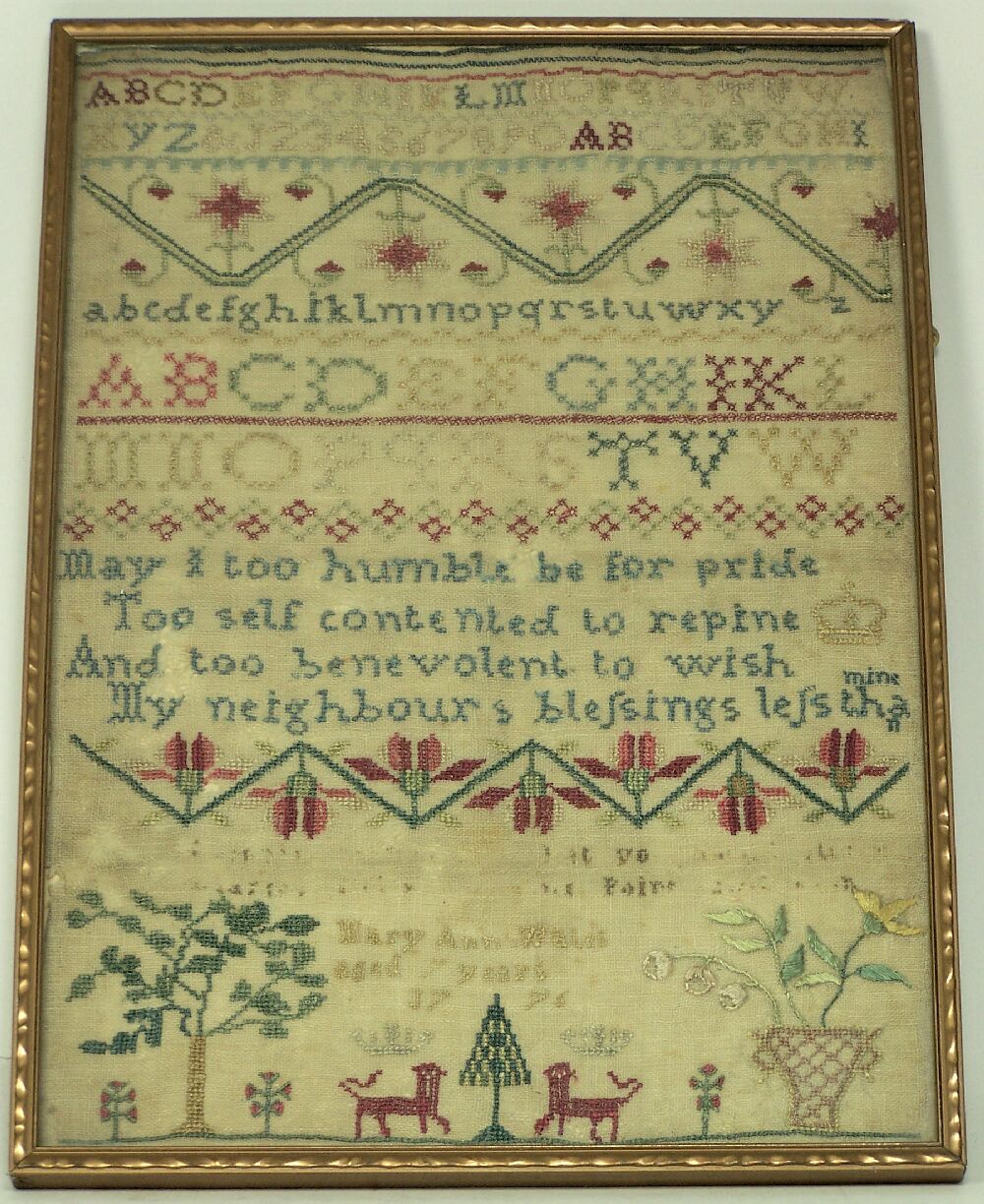 decorated with the alphabet and bands of foliage around the verse: 'May I too humble be for pride, Too self contented to repine, And too benevolent to wish, My neighbours blessings less than mine', the lower border with a tree and flower-filled jardiniere flanking the signature of 'Mary Ann Wales, Aged 7 years, 1776' above a pair of crowned lion motifs, a label verso inscribed: 'For Winnie 18th Nov. 1978, please accept this little gift as a token of our esteem of your beautiful playing and boundless generosity. In deepest gratitude & love, Keith & Francesca'