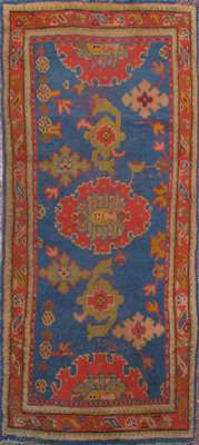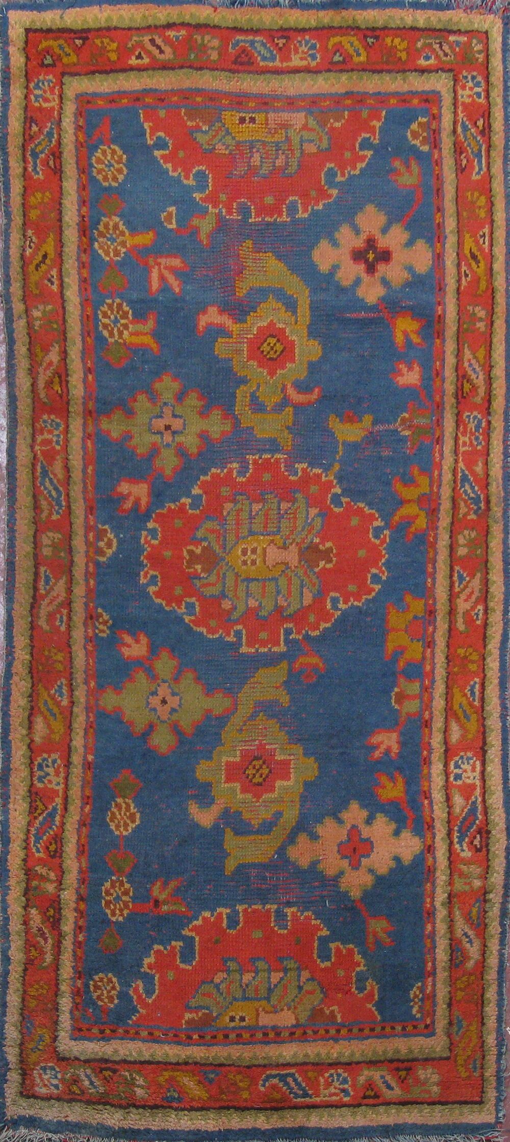 late 19th/early 20th century, the blue field with central and two half red medallions, within red stylised vine border between bands