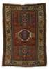 late 19th century, each with red field with central ivory hooked banded medallion flanked on each side by a green square medallion, within camel turtle palmette border between green and indigo bands (2)