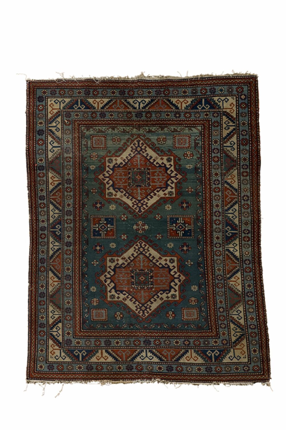 late 19th/early 20th century, the abrash green field with two ivory and red hooked shaped medallions, within ivory double hook and serrated leaf border between light blue rosette bands and red zig zag bands