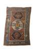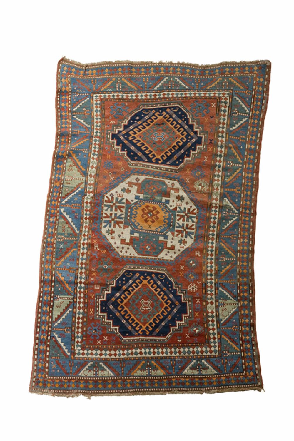 late 19th/early 20th century, the red field with central ivory octagonal medallion flanked on each side by two indigo stepped lozenge medallions, within blue striped wine glass and serrated leaf border between ivory and blue skittle bands